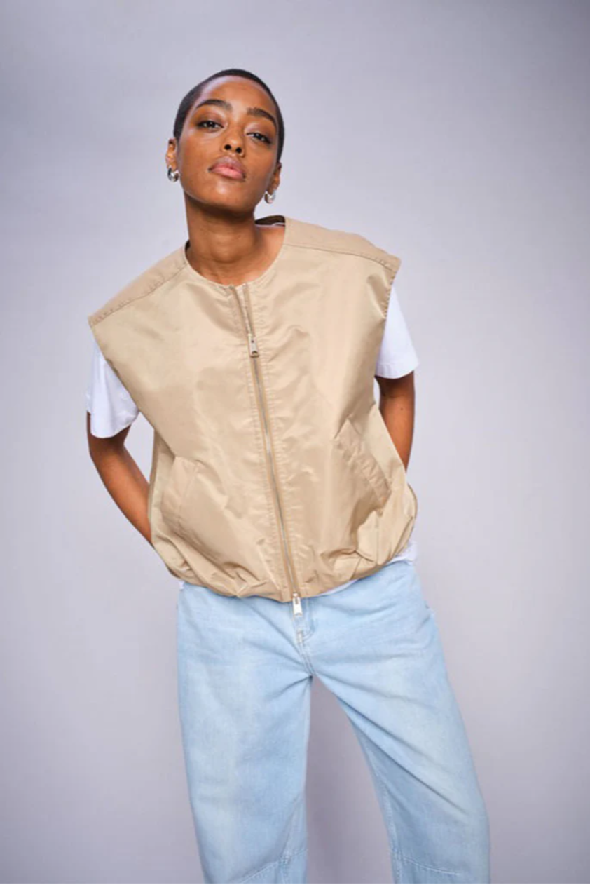 Mos Mosh Kura Solid Waistcoat is a voluminous style bomber waistcoat with an elasticated bottom for a bubble effect, complemented by a two-way zipper and slant side pockets. Perfect as a transitional piece, it pairs effortlessly with vintage wash denim and a simple white tee for a laid-back, stylish look. Great Seasame colour!