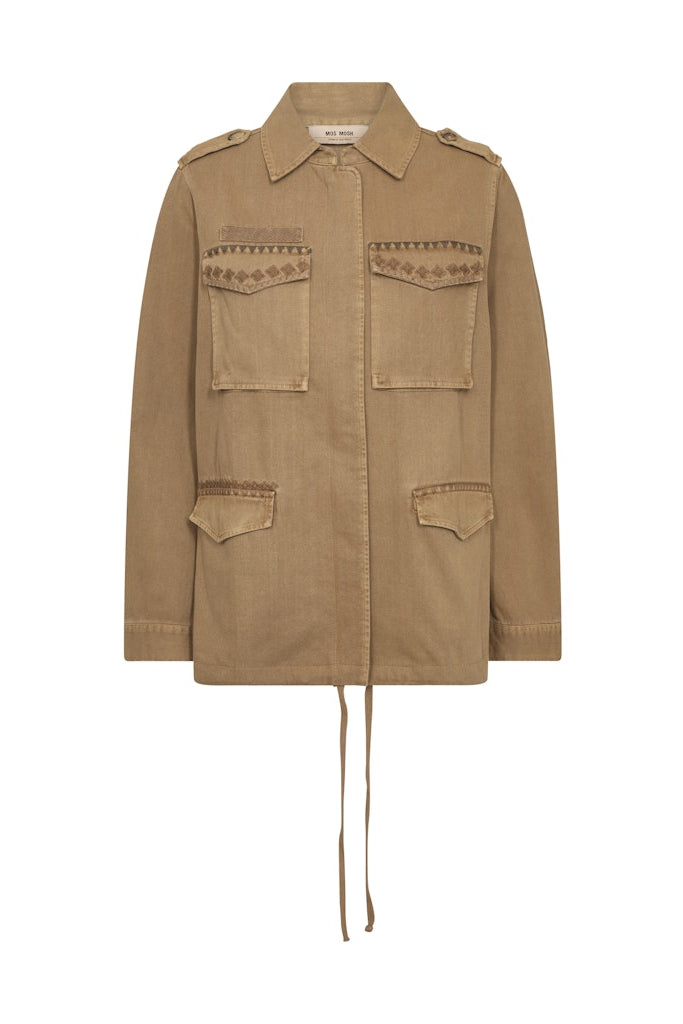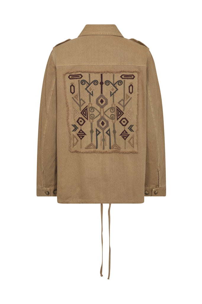 The Zoa Uti Jacket seamlessly blends practical design with refined aesthetics. This piece showcases a structured collar and hidden button front that creates clean lines, complemented by adjustable drawstring detailing at the hem for personalized silhouette control. Shoulder strap accents and intricate embroidery provide visual interest, while snap cuffs enhance versatility for layering across multiple occasions. A sophisticated choice for those seeking functional unique style.
