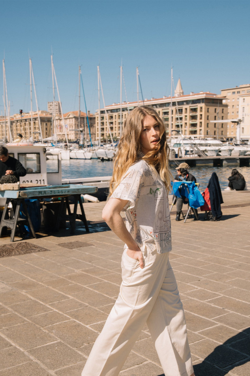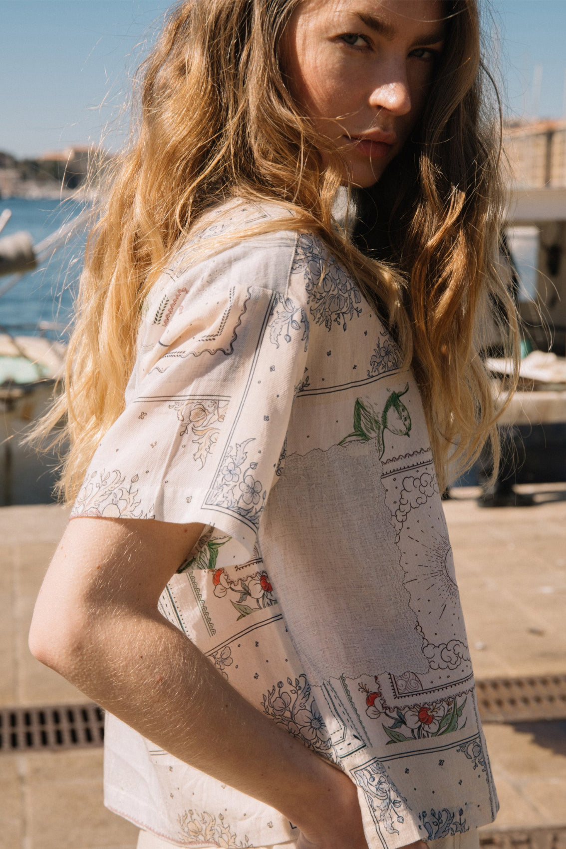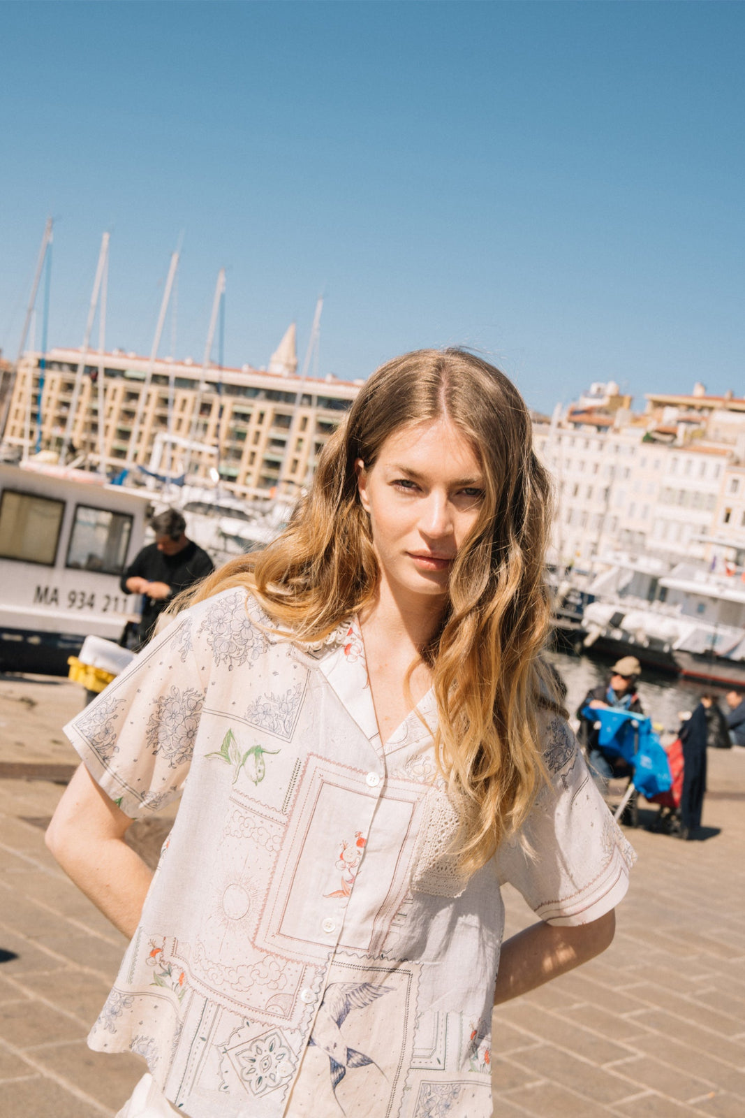 Cotton shirt with lapel collar, slightly dropped shoulder and short sleeves. Slightly sheer organic cotton fabric with a very special touch of crochet on the collar and front patch pocket. A special piece for this season.