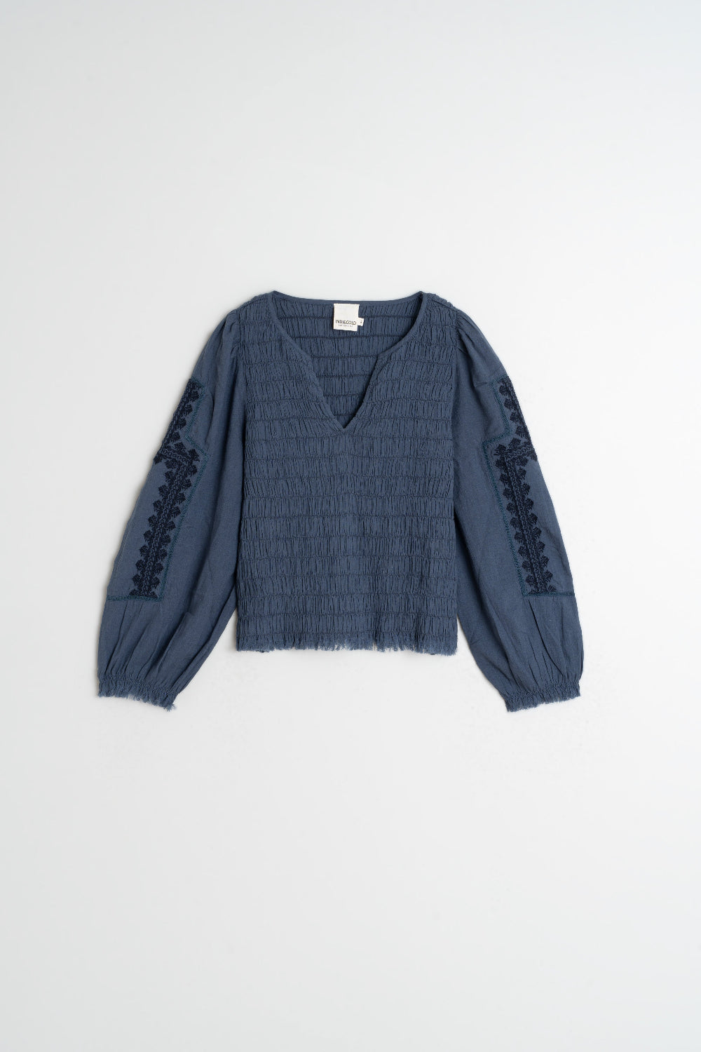 • Ethnic embroidery on the sleeves and finished on bottom hem and cuffs with frayed trim