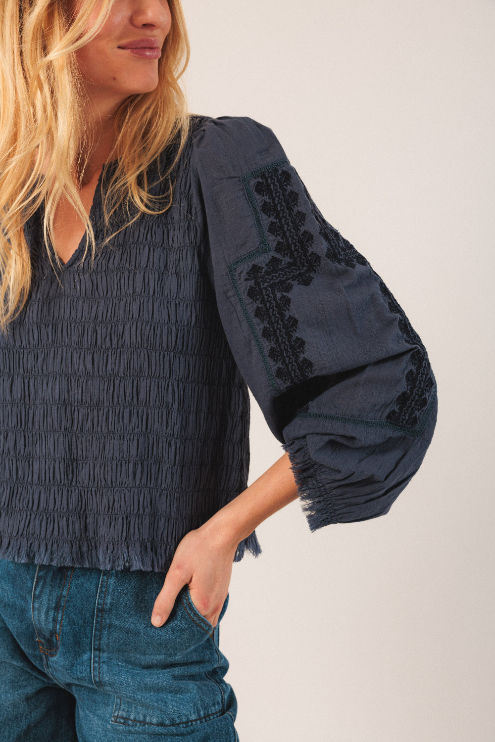 Short blouse, sitting above the hips, with a round neckline ending in a V and embroidered ethnic details on the sleeves. The elastic waist and frayed finishes are a must-have for everyday wear.