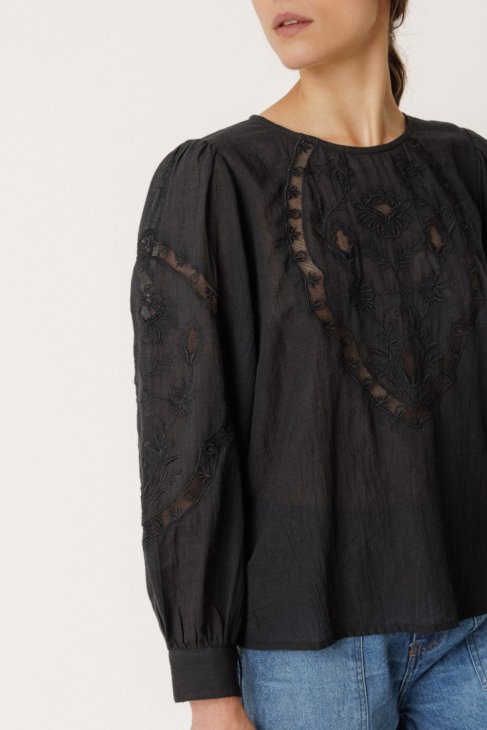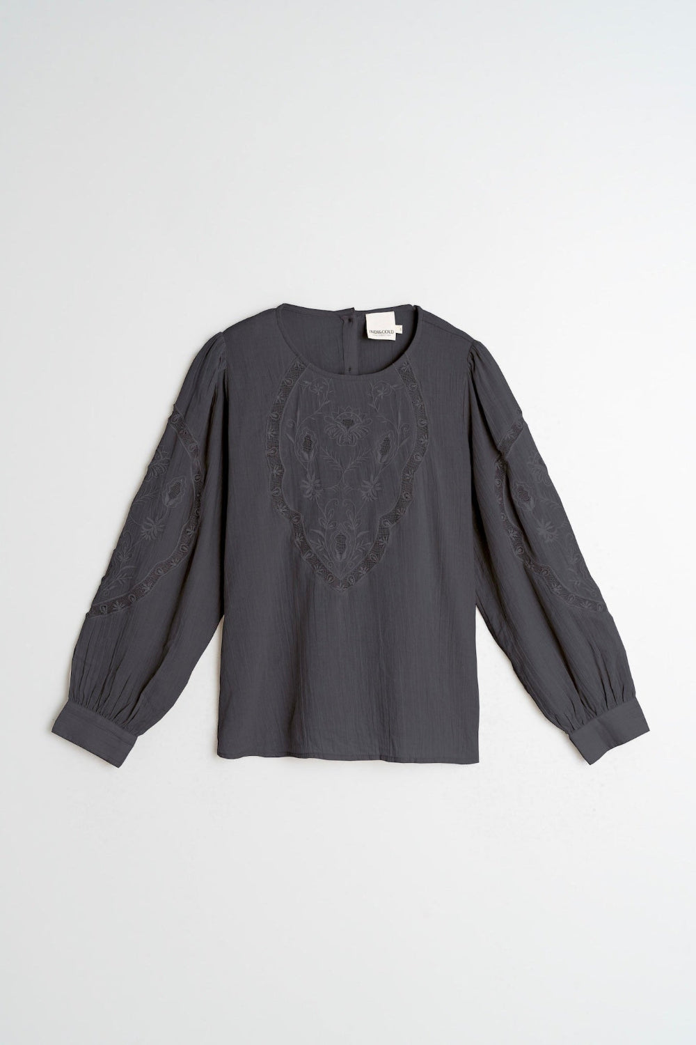 Indi & Cold Florencia features a round neckline and a teardrop button closure at the back. It has a floral embroidery motif worked on a netting-print base. This special garment will give a sophisticated touch to your look this winter.