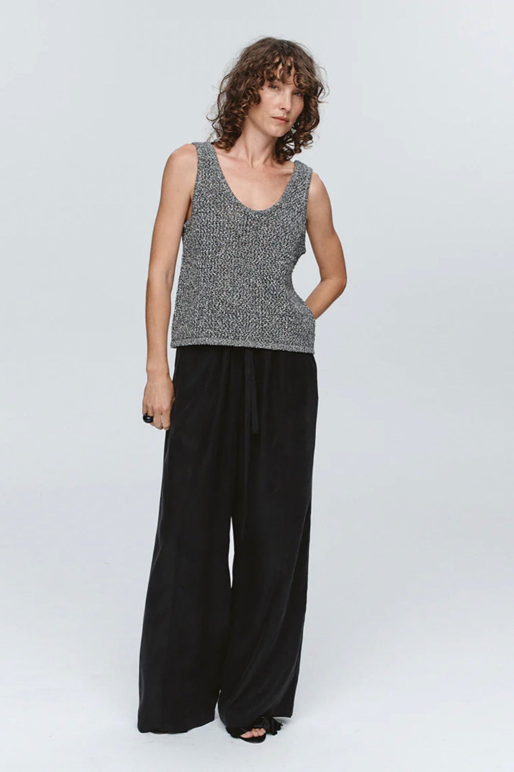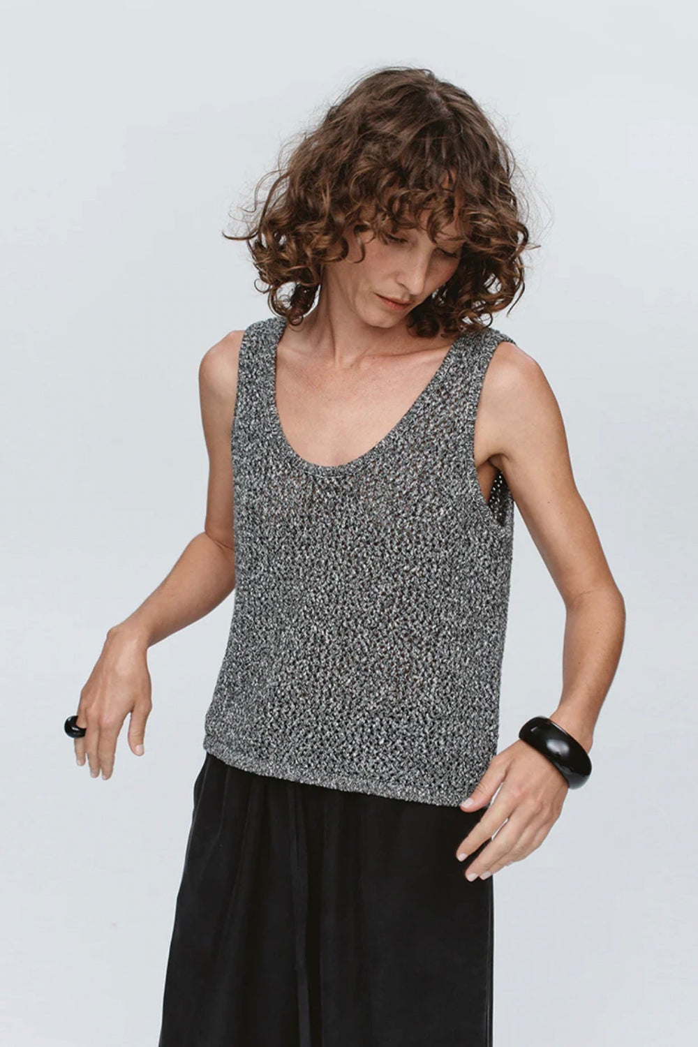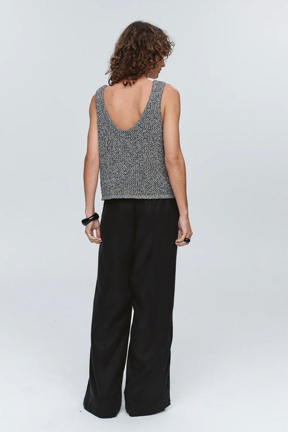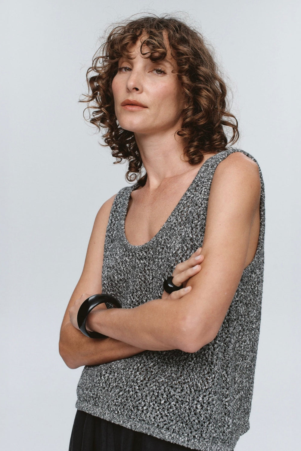 The Nova Top by Marle is an elegant sleeveless knit made from 100% cotton in a refined black and ivory mélange. Featuring a wide scoop neckline and a gracefully relaxed silhouette, it drapes smoothly over the body for a timeless and sophisticated look.