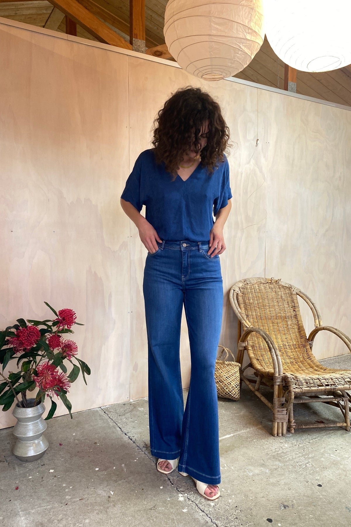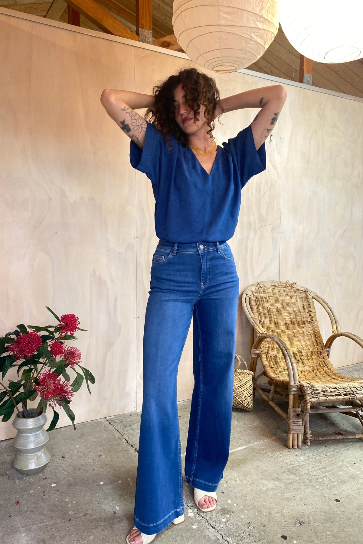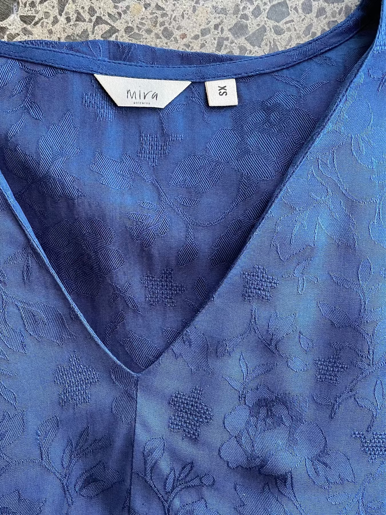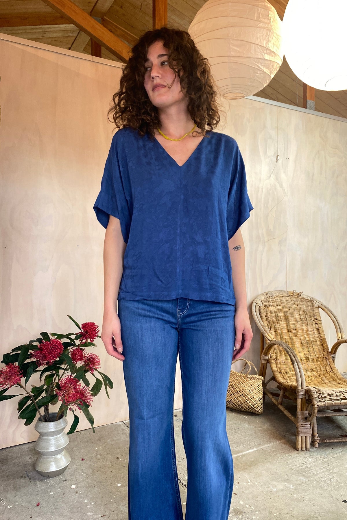Mira Demi Top is a flattering V neck line top with simple clean lines. Looks great worn out or tucked in, made in a light floral jacquard that has a slight sheen.