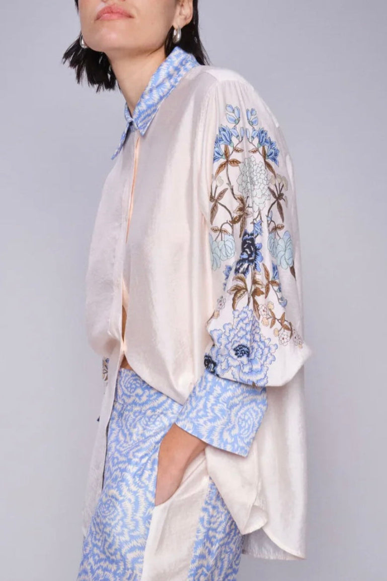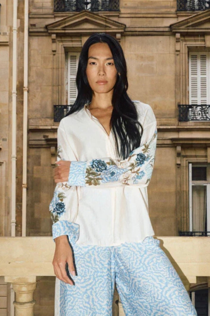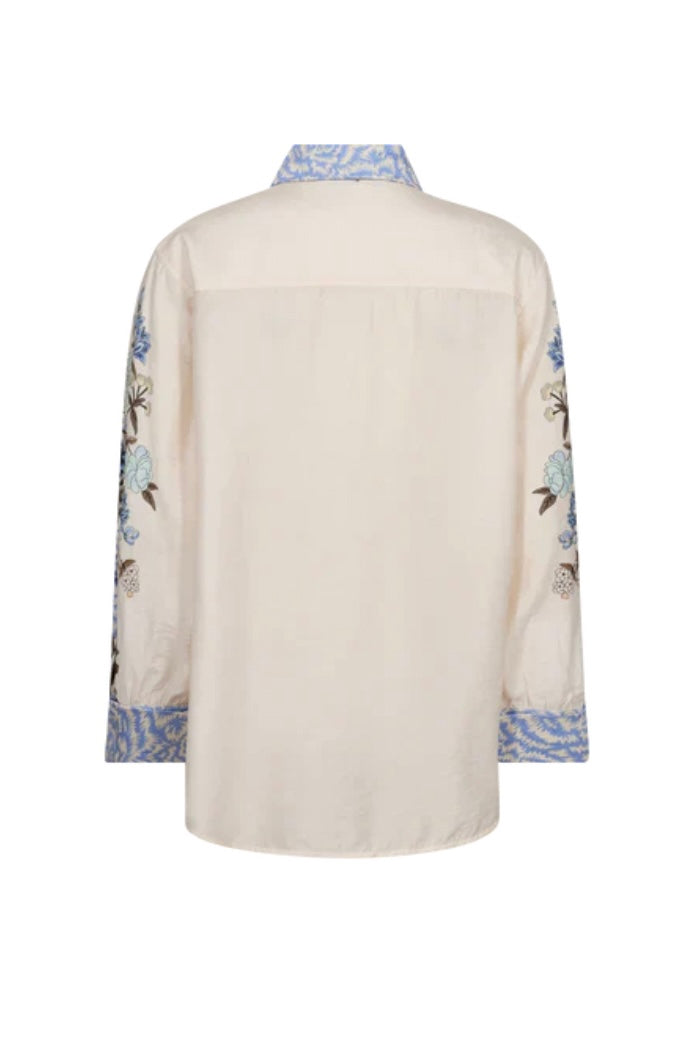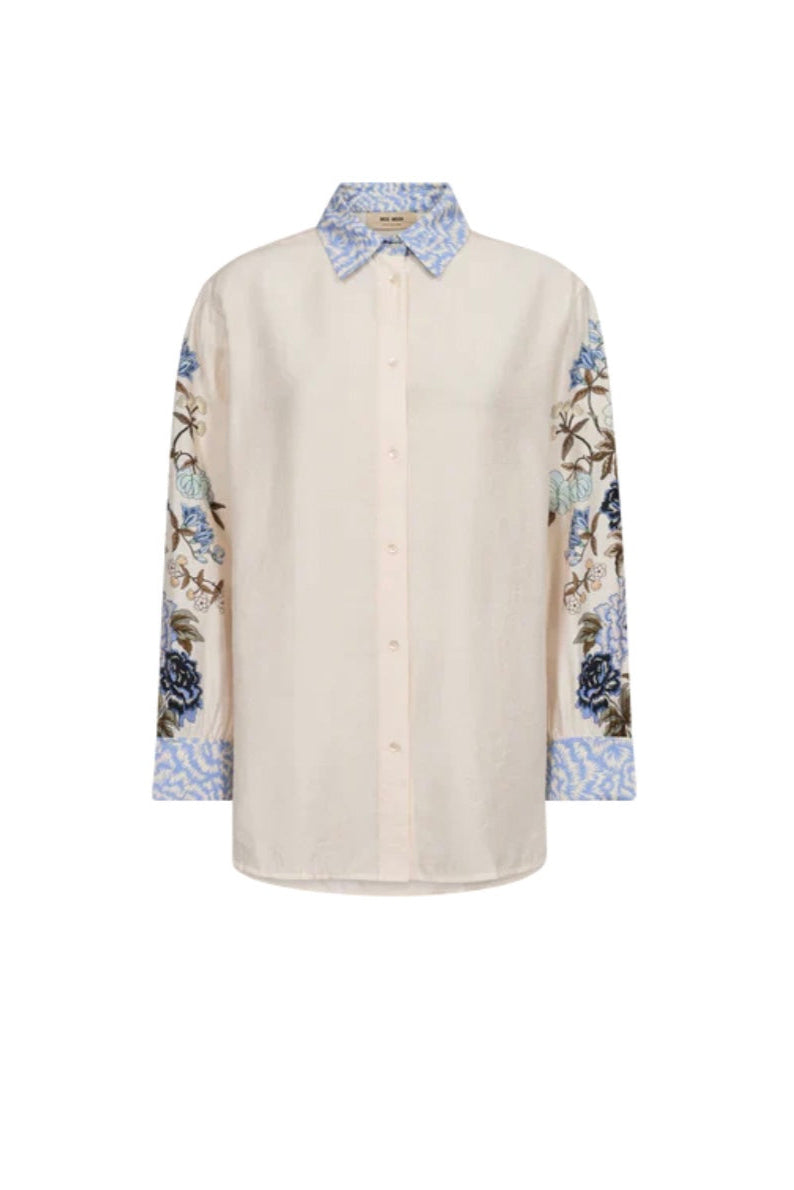 Mos Mosh Abila Saku Shirt crafted in a relaxed silhouette with a button closure and striking saku floral detailing on the sleeves. It’s finished with a contrasting collar and cuffs in a vibrant floral print. Great shirt to wear with denim or dress up with wide leg pants in navy or pick out the sage green or blue tones.