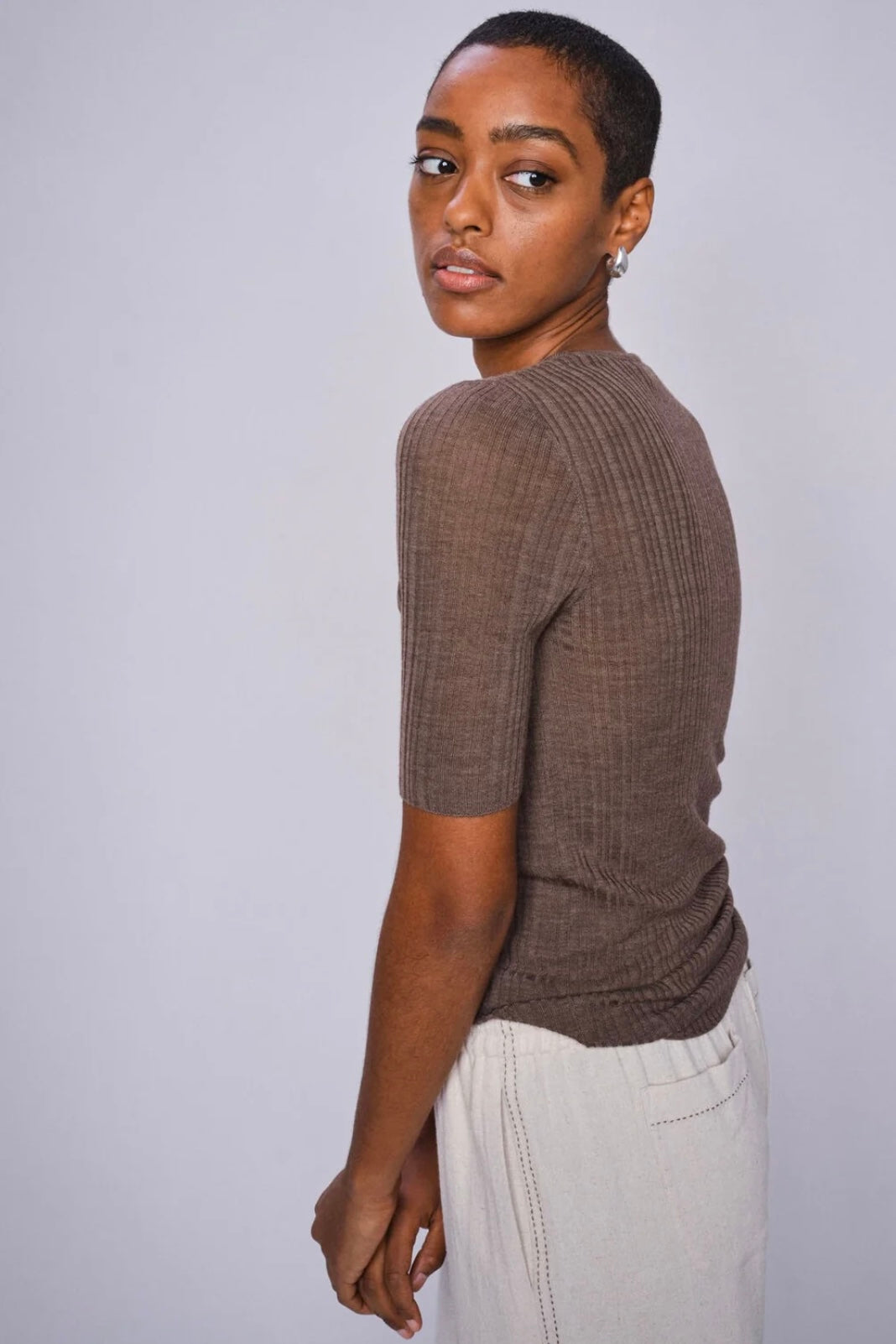 Meet your go-to for those unpredictable spring days: this ultra-soft short-sleeve knit, crafted from responsibly sourced wool in an irregular knit pattern. With its flattering, figure-hugging silhouette, it’s the perfect blend of comfort and style.