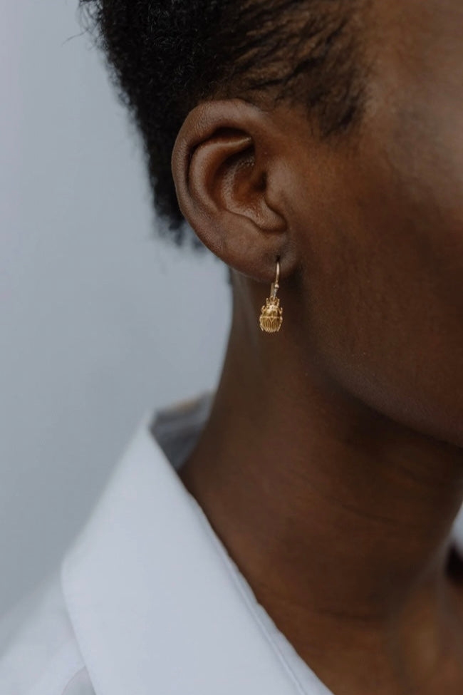A petite Scarab charm on a French ear wire, from Charlotte's Nefertiti’s Daughters collection, an exploration into protection symbols, empowering gemstones and ancient form, in a modern context. To usher in the new era.