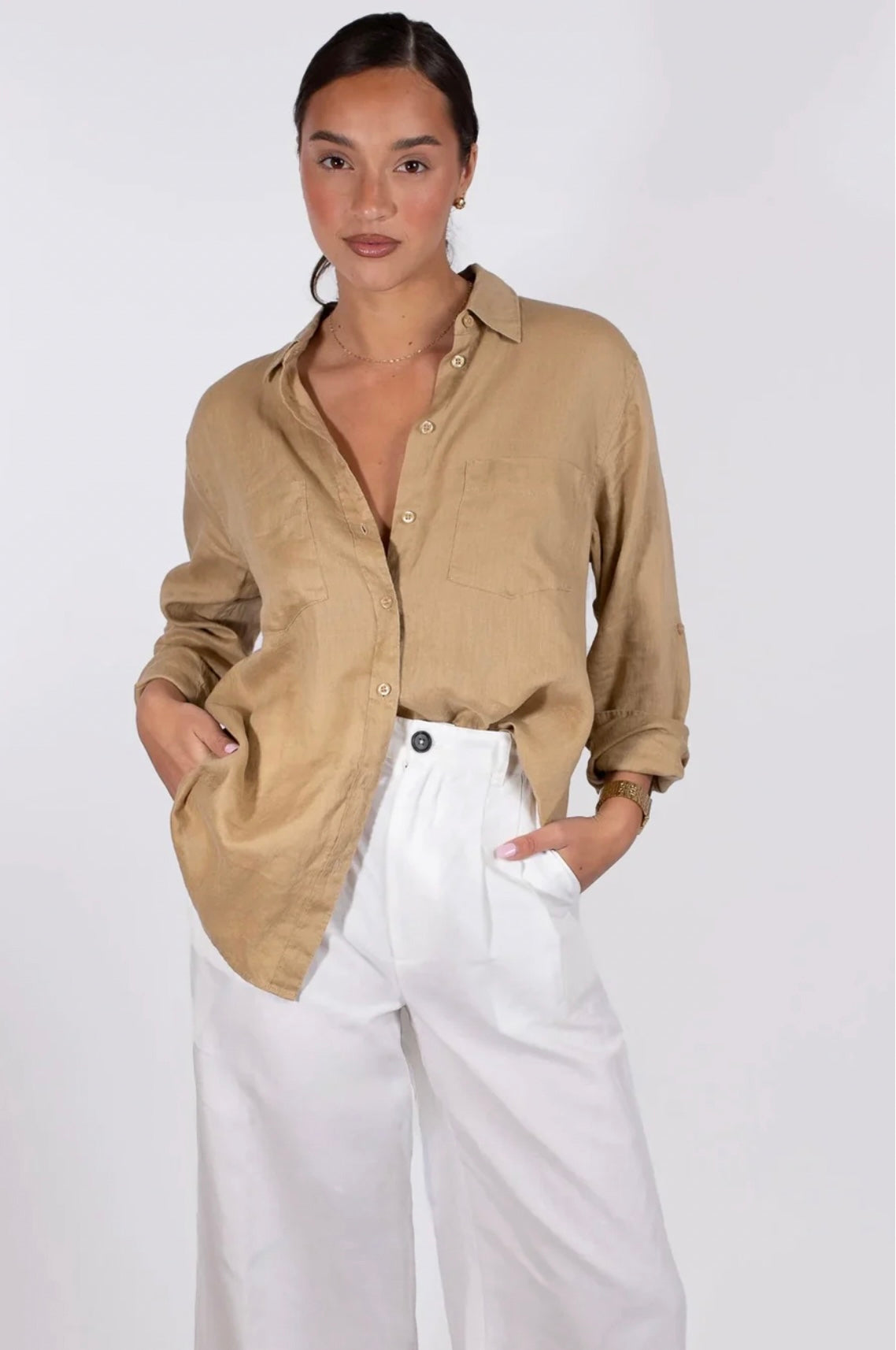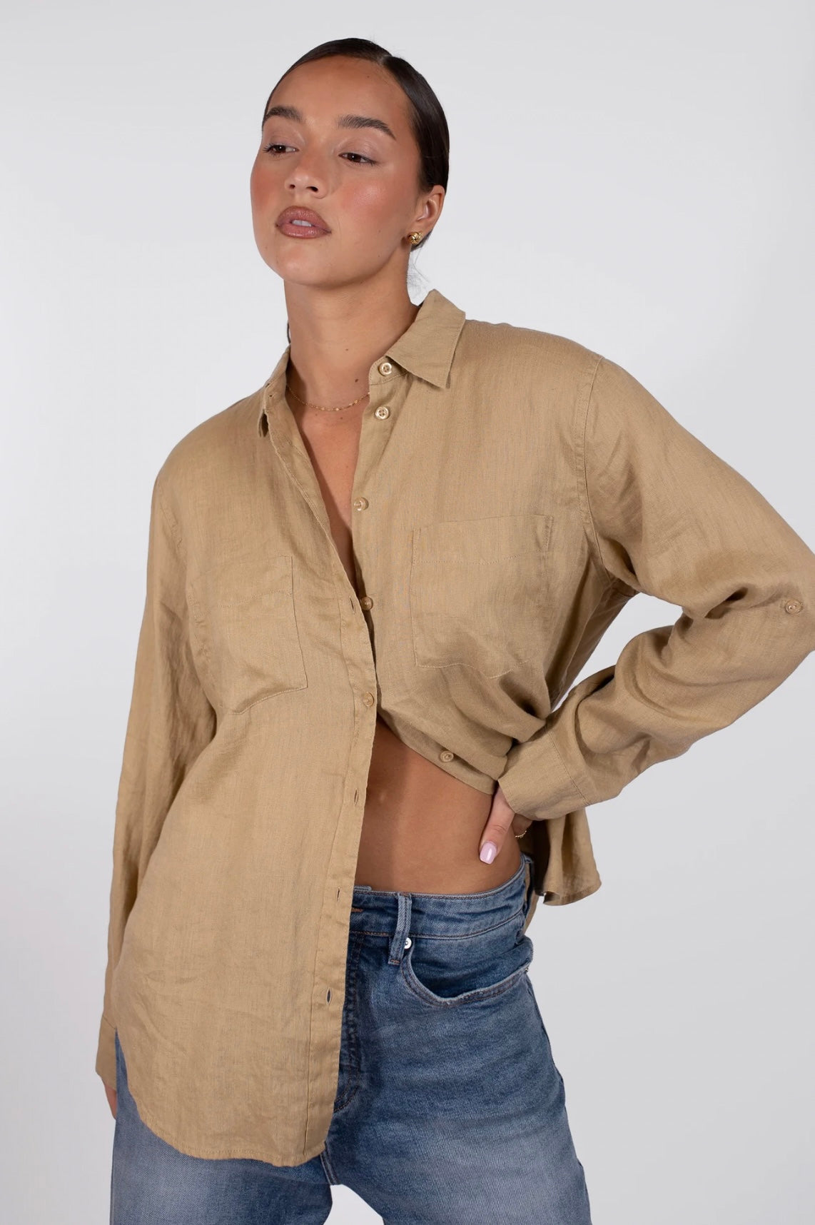 The Boyfriend Linen Shirt in croissant a timeless shade of tan that will go with everything this summer.