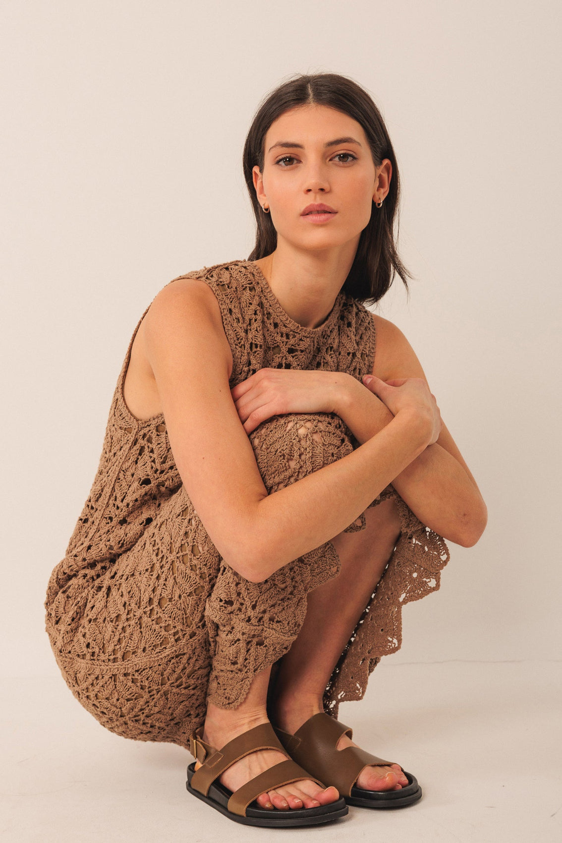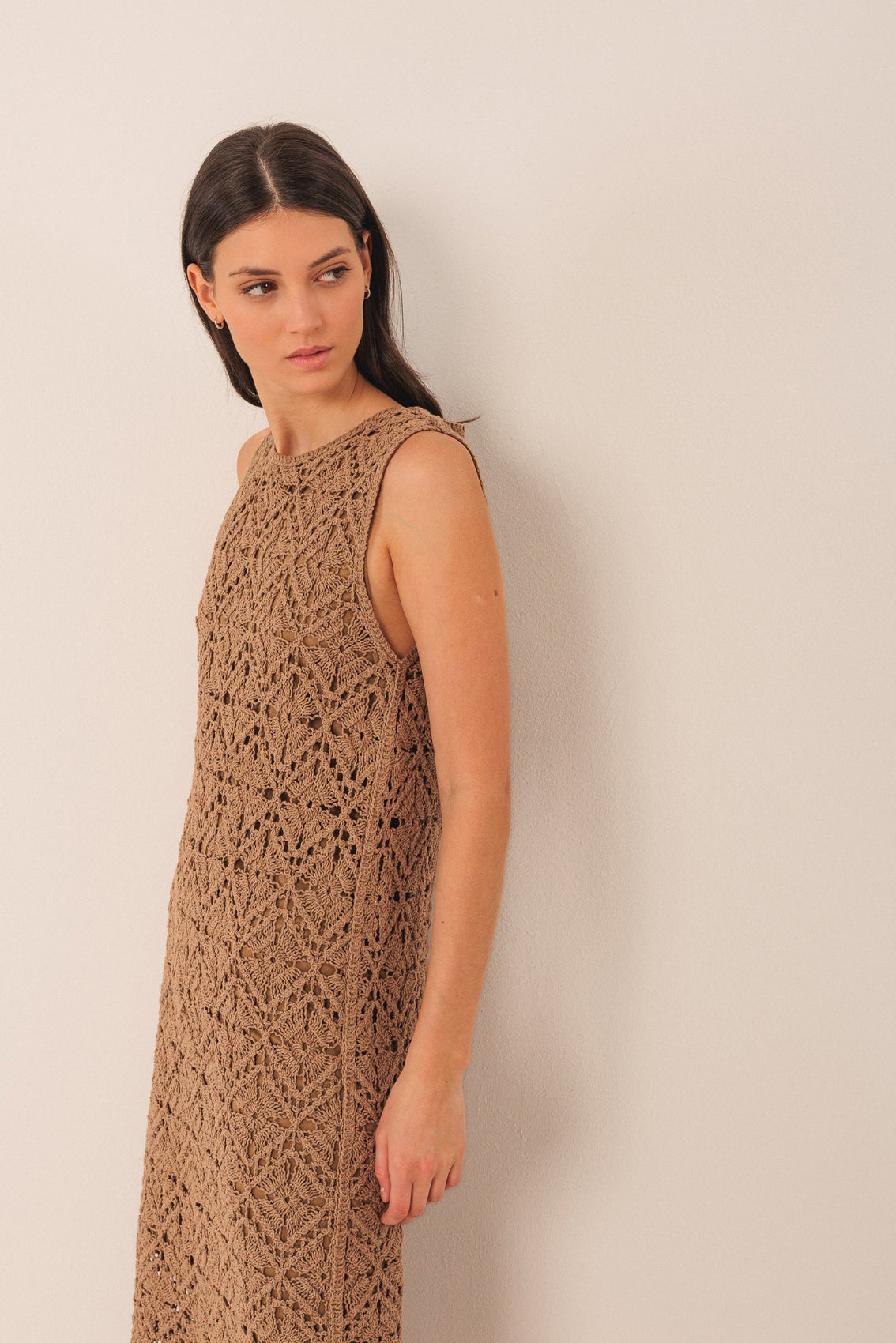 Crocheted cotton piece with geometric motif, round neck and fitted shoulder. It has an invisible zipper closure at the back and an interior lining.