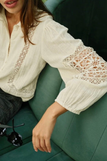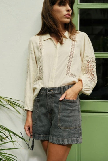 The double gauze cotton shirt is going to be a must-have this season, with its lace details inserted in the sleeves and waistband, as well as a relaxed fit.