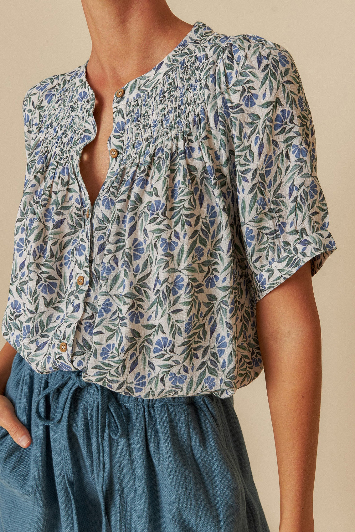 If you like to be comfortable and stylish, this short sleeve shirt with a raglan cut and smock detail on the collar will give your look a fun touch.