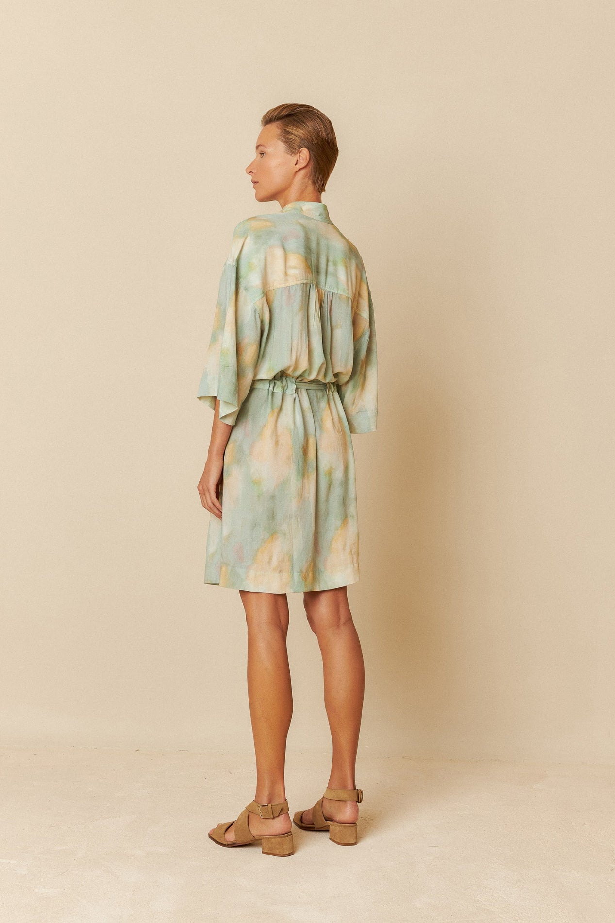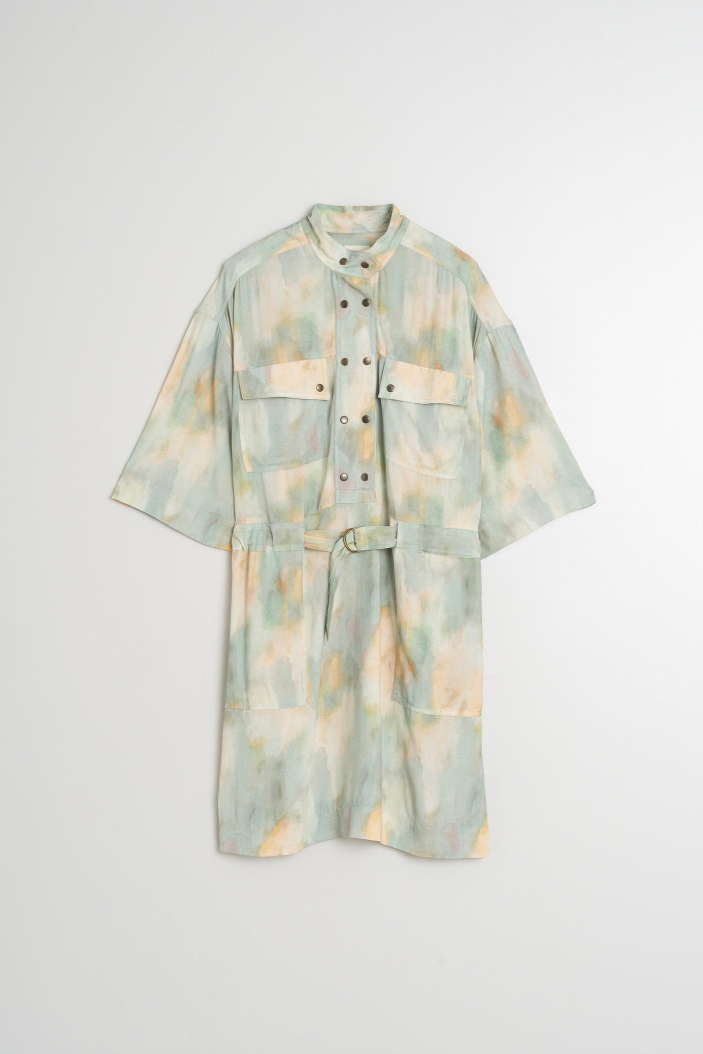 Add an artistic touch to your look with this short watercolor print dress. Crafted from sustainable viscose, its relaxed design with dropped shoulders and 3/4 sleeves makes it perfect for everyday wear. The maxi patch pockets add functionality, and the removable belt allows for a customized fit.