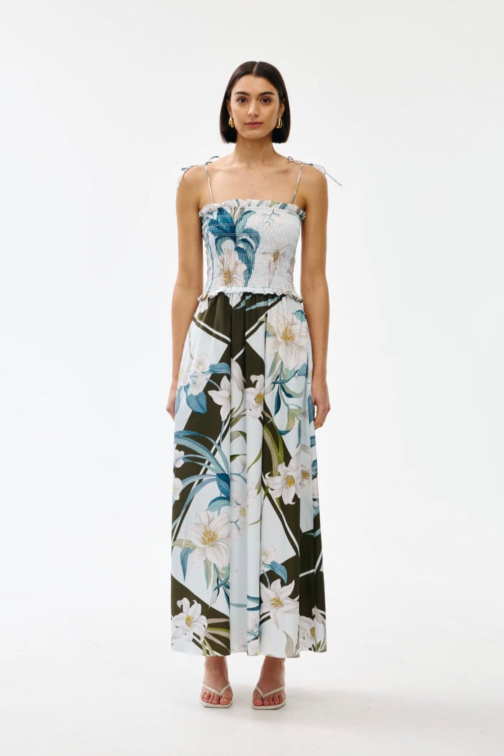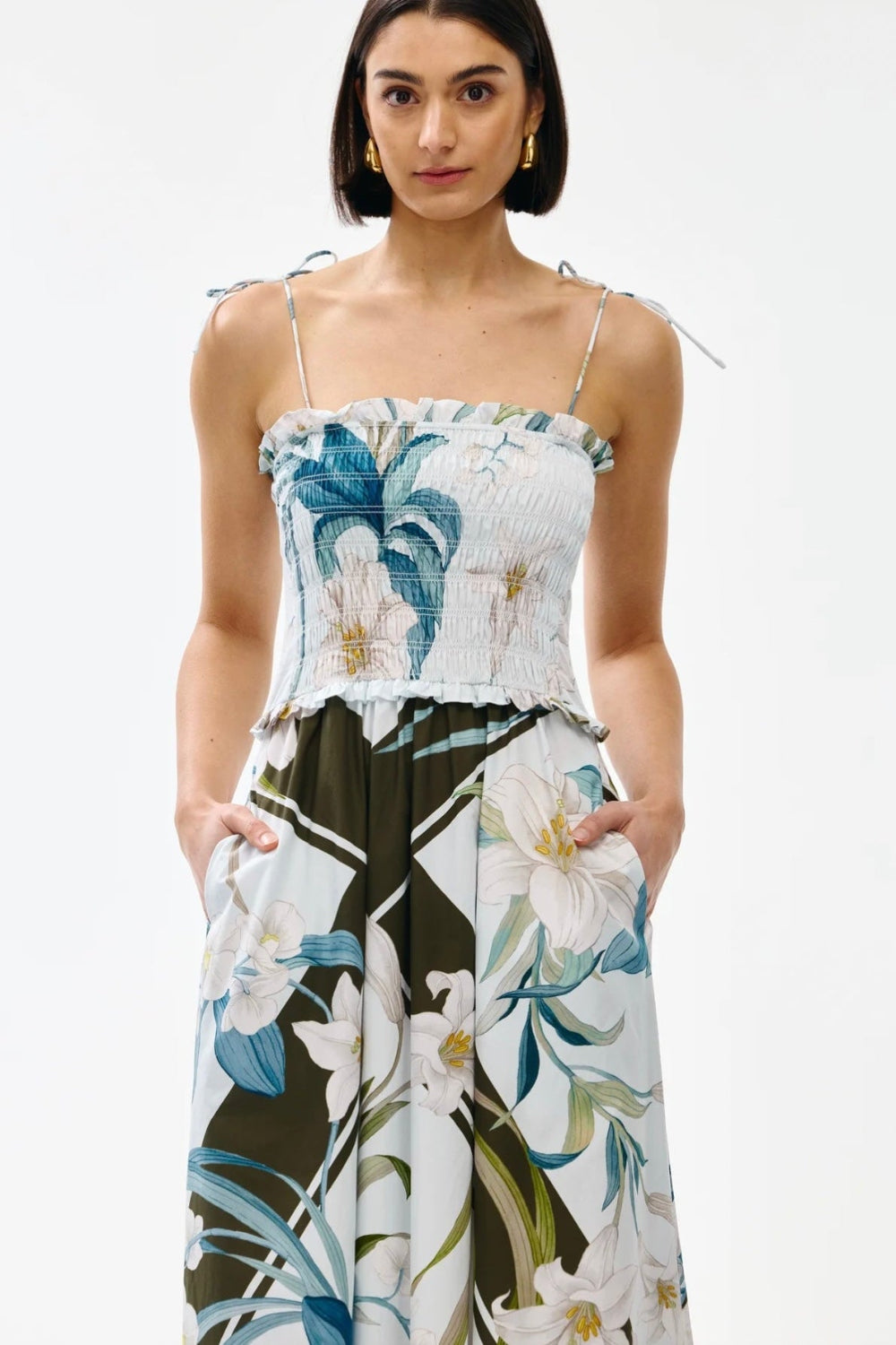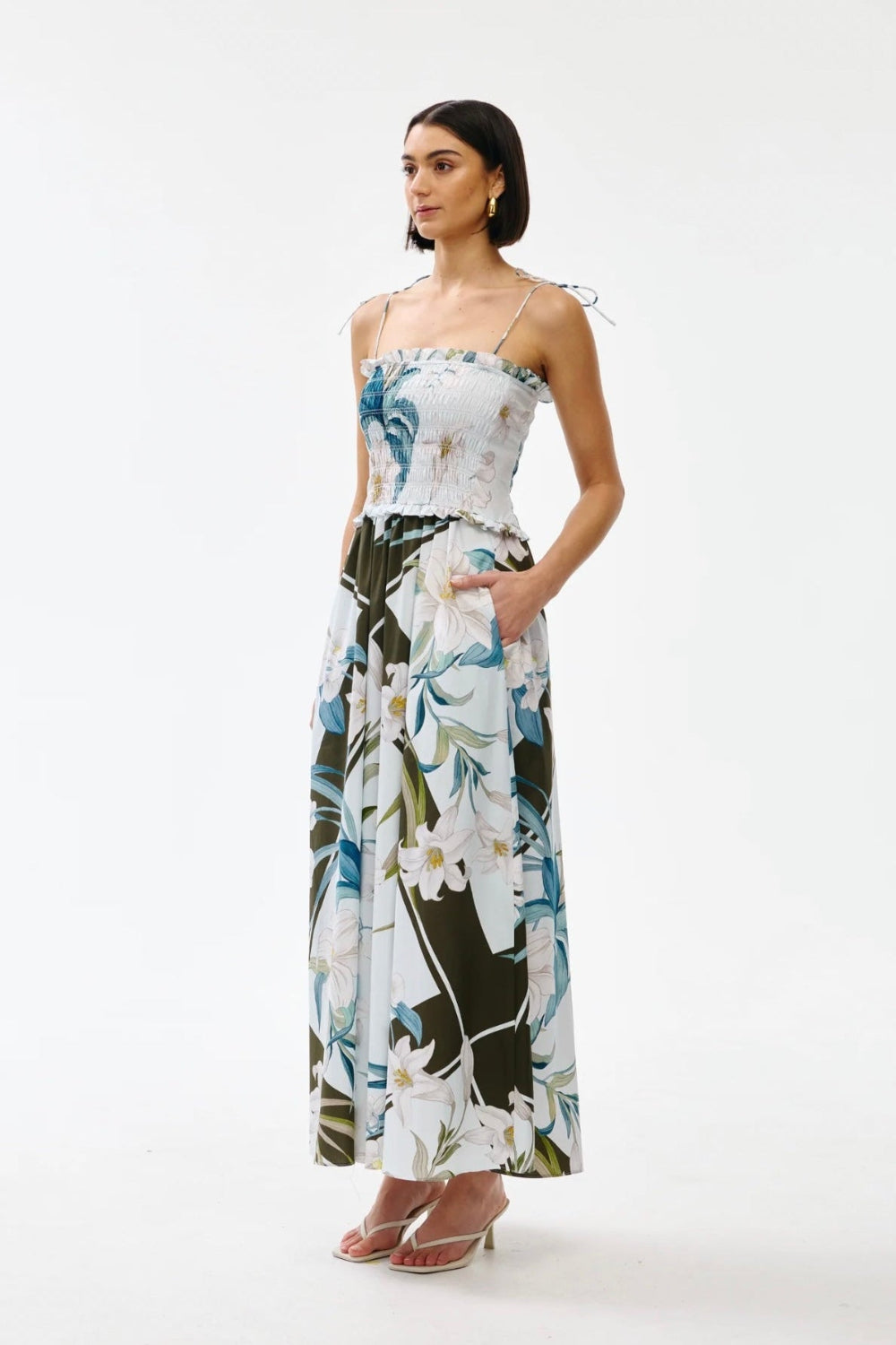 Crafted from a soft, cotton poplin fabrication, this dress features an elasticated ruched bodice with delicate frill detailing, in seam pockets and adjustable tie straps for a perfect fit.