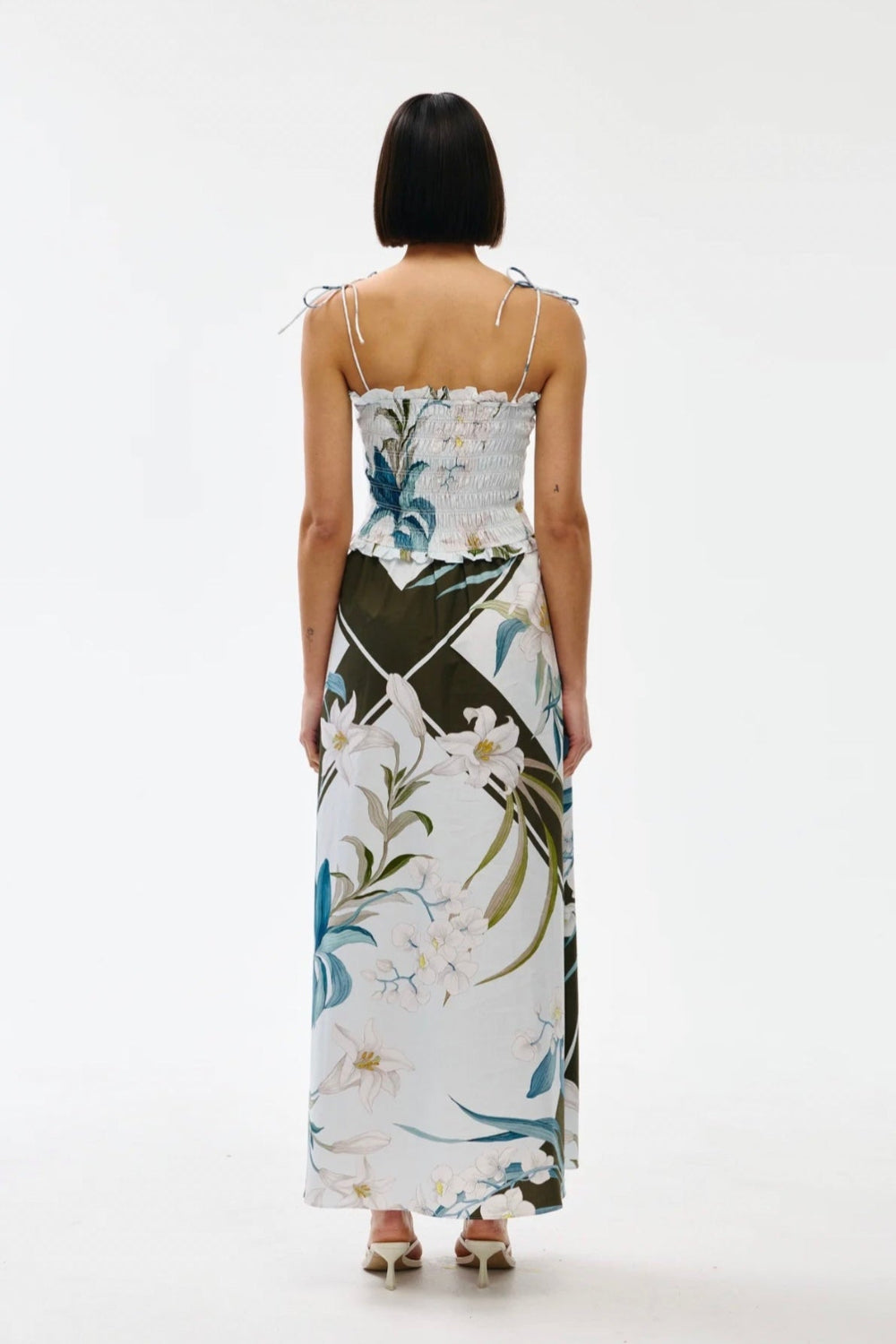 The flowing maxi skirt falls gracefully to the floor, making it the ideal piece for your warm weather wardrobe. Style with sandals or dress it up with heels for a chic, polished look.