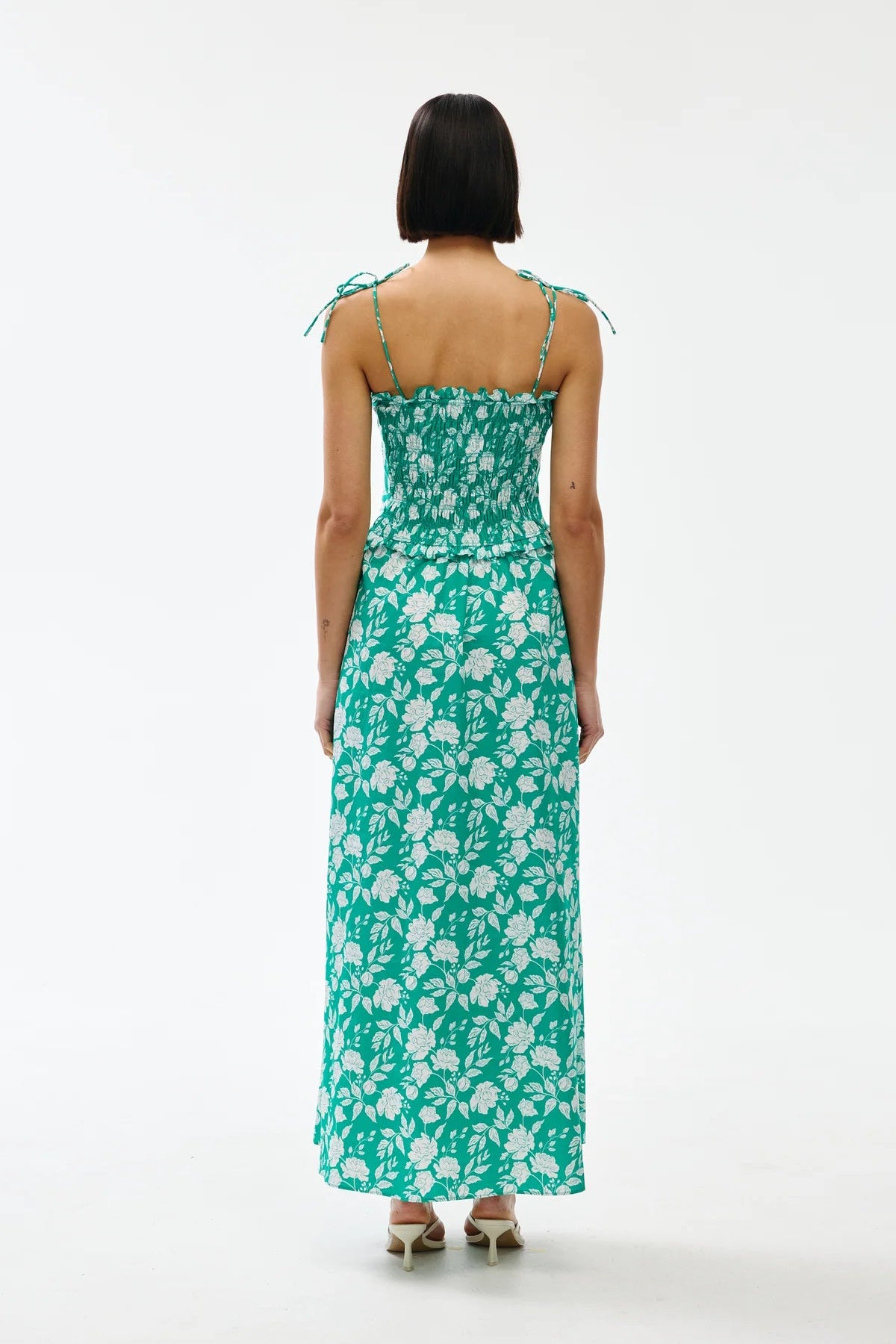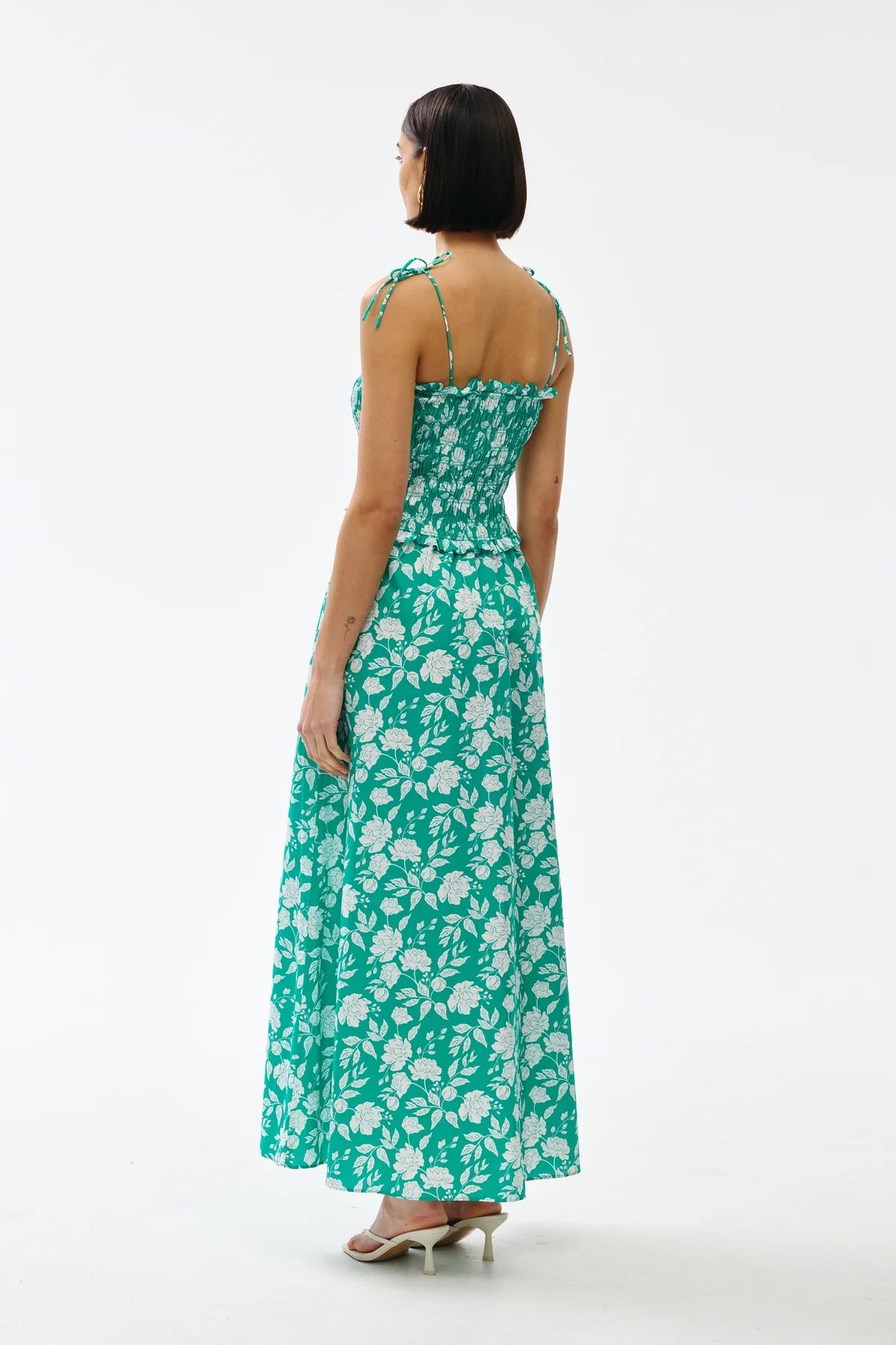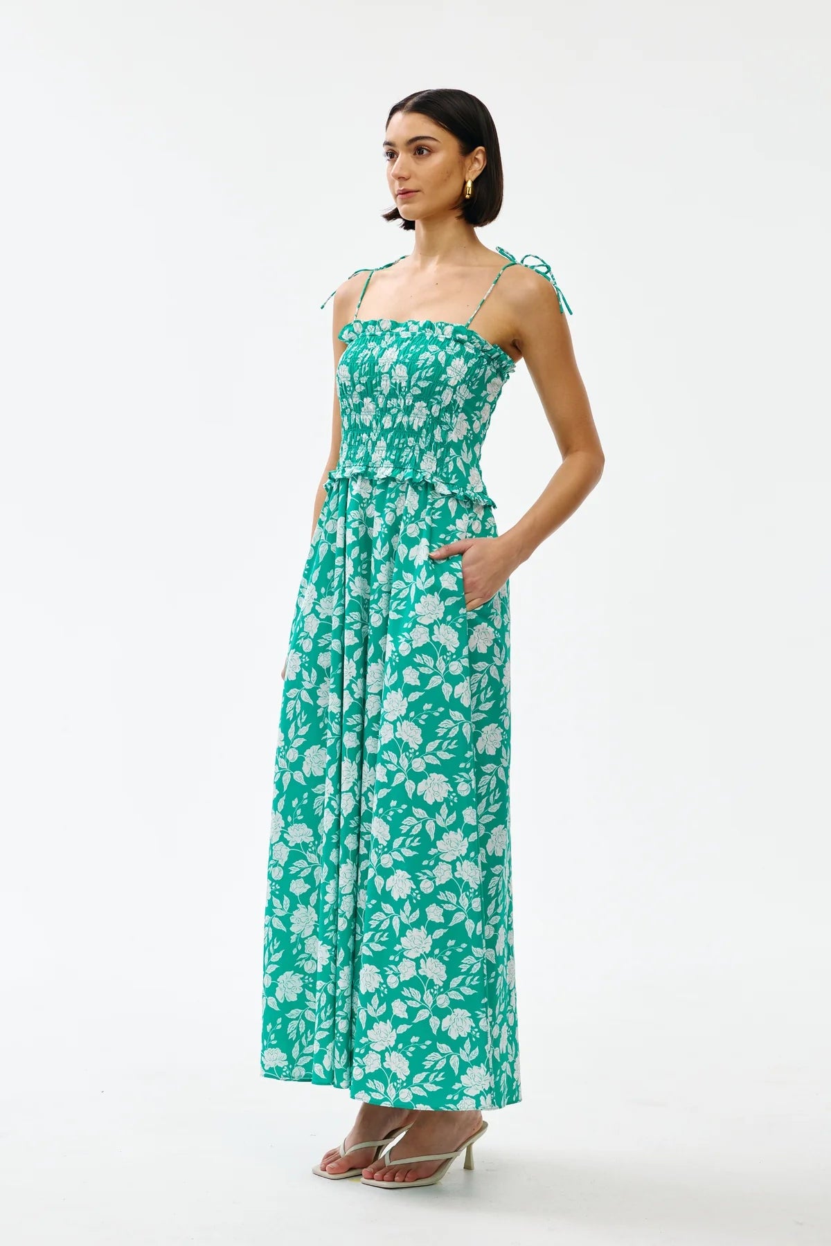 The Billy Dress in Taormina embodies effortless elegance with a botanical floral patternset against a vibrant emerald green base.