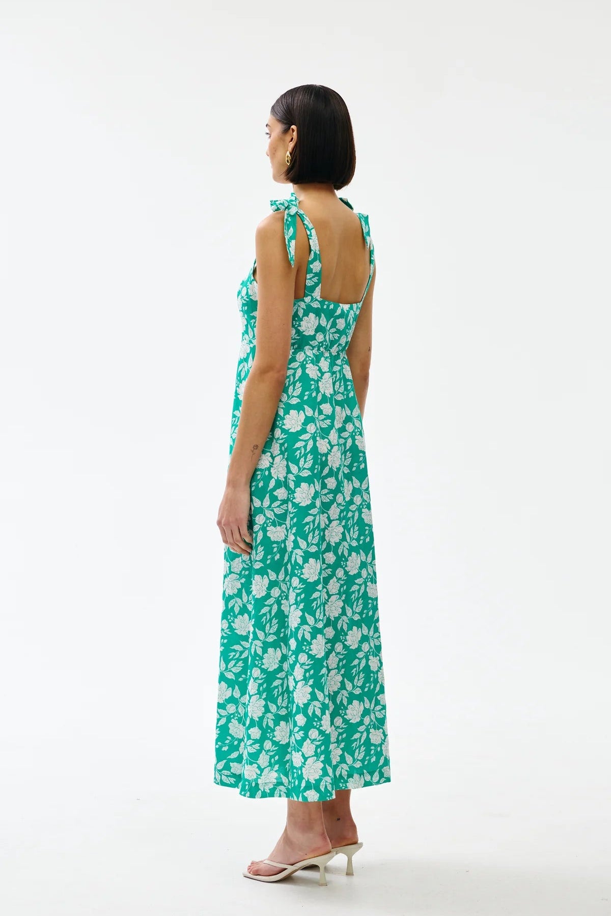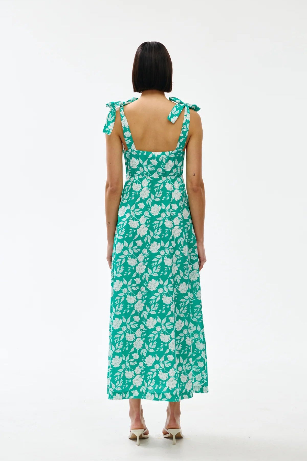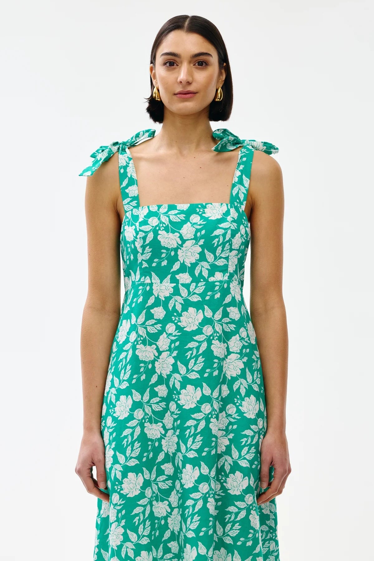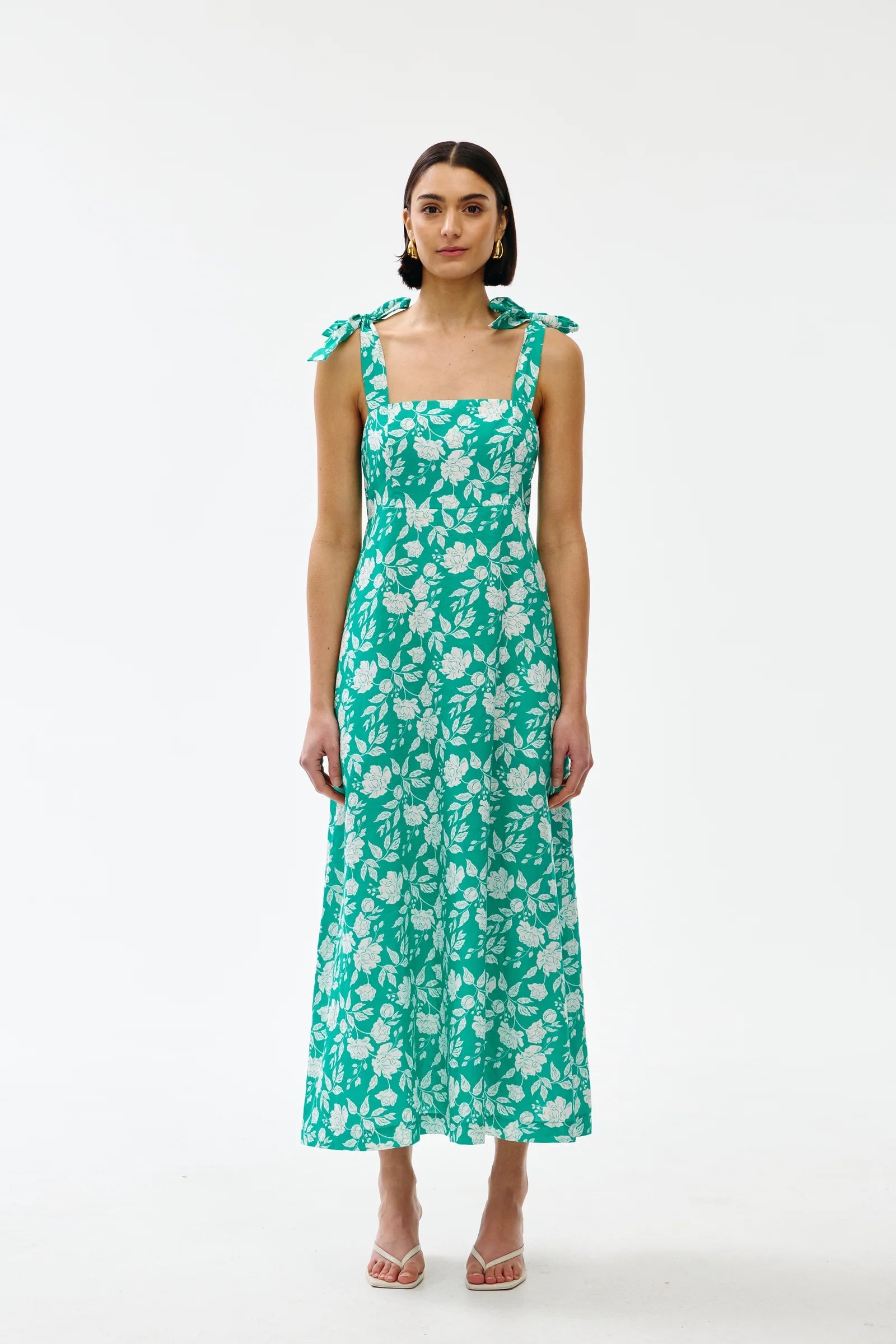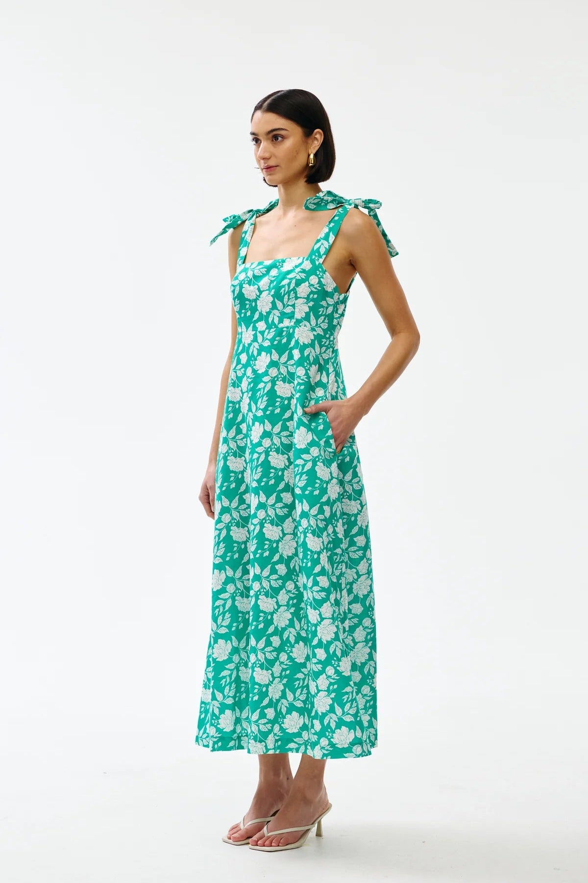 The Ruby Dress in Taormina offers a relaxed fit and breezy silhouette, this midi dress features a straight neckline, in-seam pockets, invisible zip at the side, and wide shoulder straps that can be tied on your shoulders to achieve the most comfortable fit.