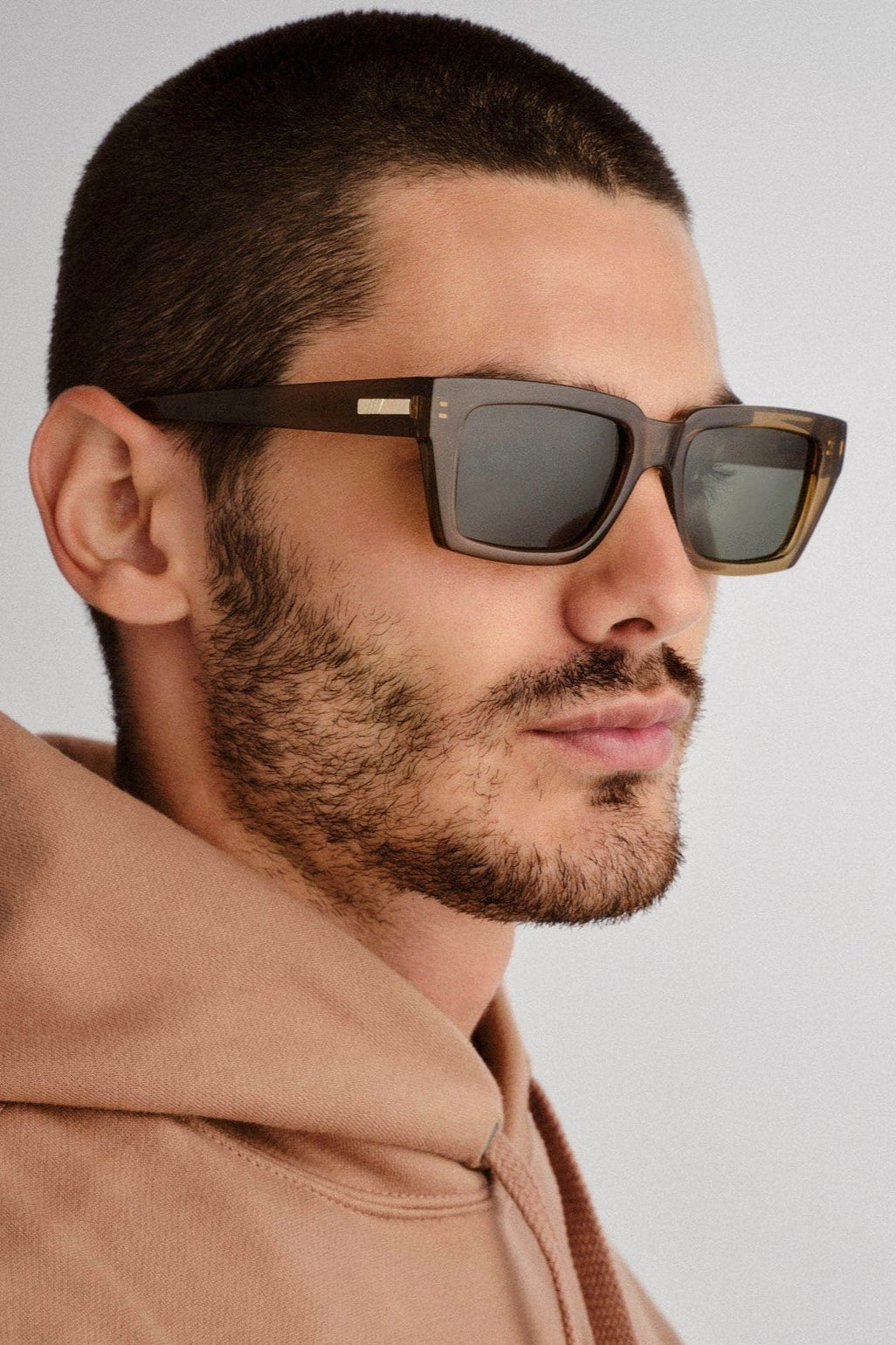 A contemporary update to the classic D-frame, our NOCTURNAL HABIT sunglasses deliver a bold look. With larger proportions and a striking flat frame profile, this pair is accented with horizontal stripe flagstripe hardware and subtle bevel detailing.