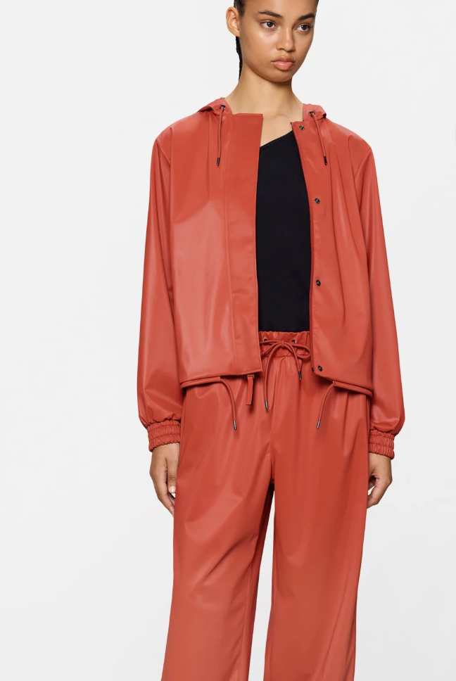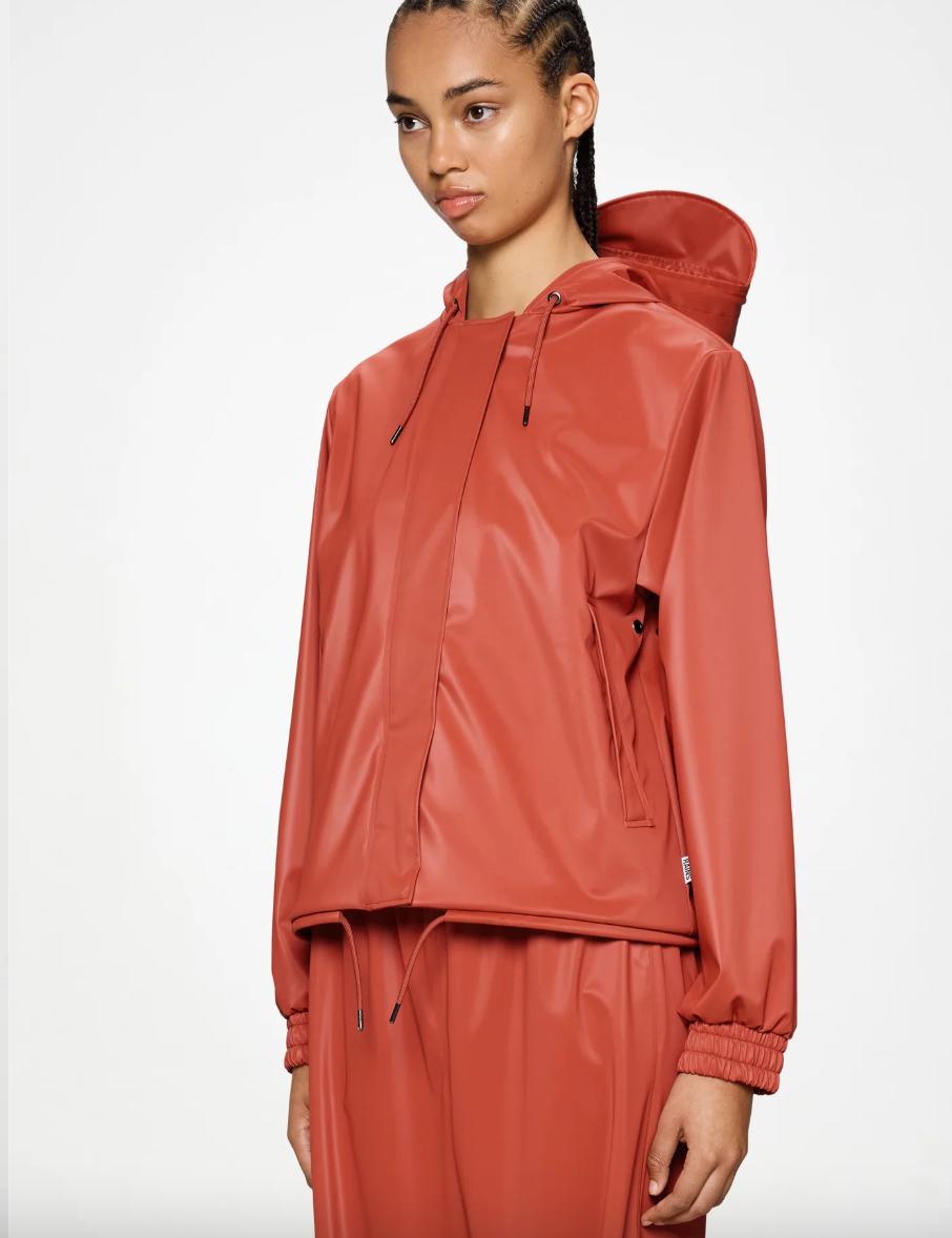 String W Jacket is a women's rain jacket in a loose and cropped fit. Design is characterized by a luxe-sport aesthetic.