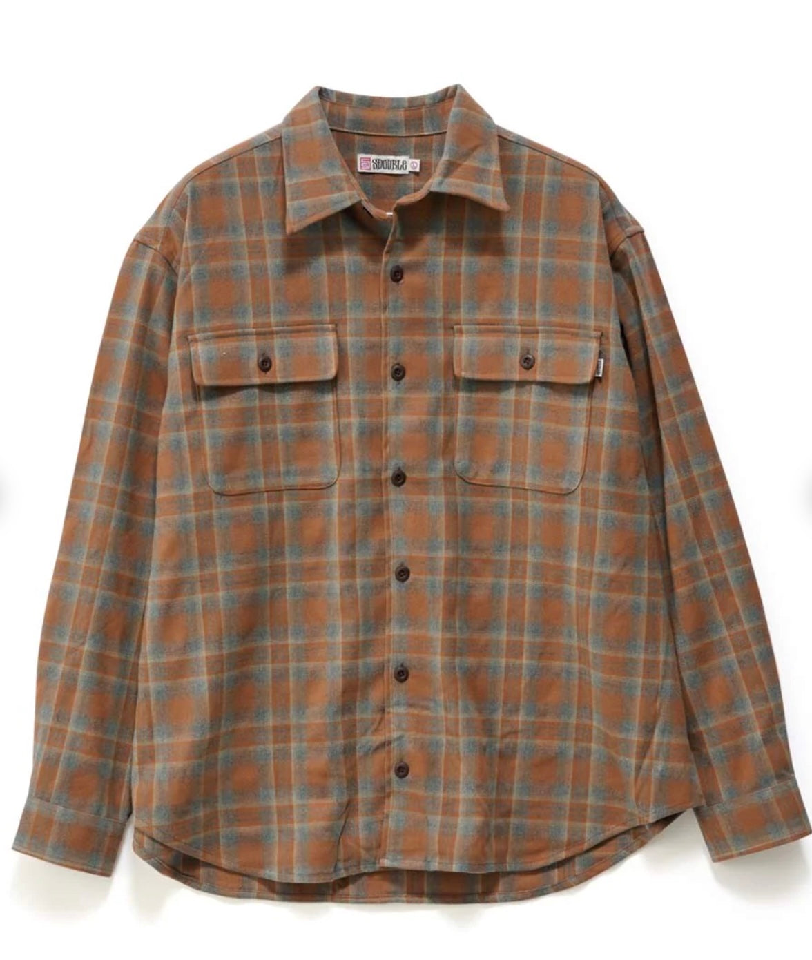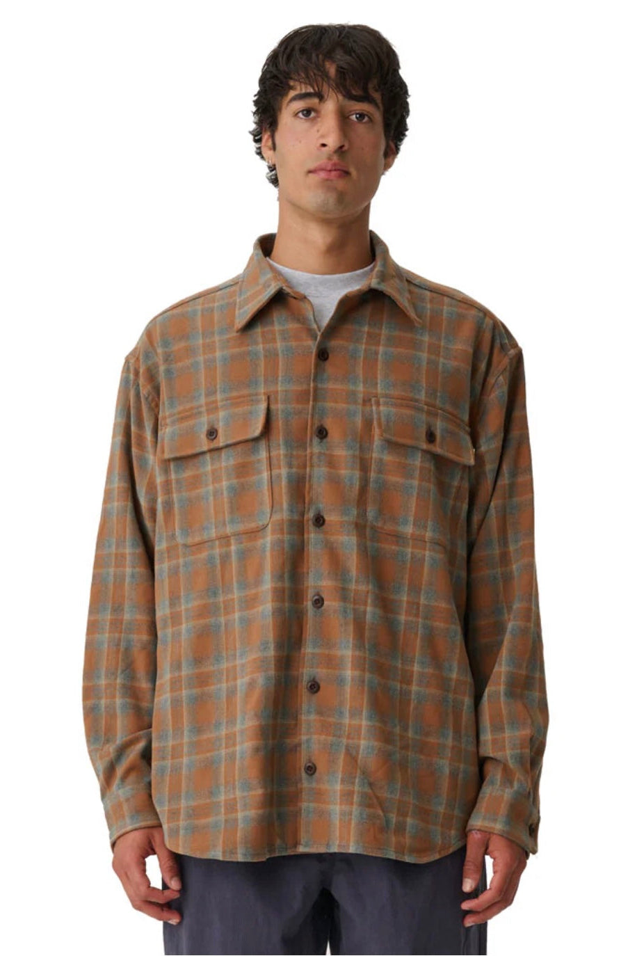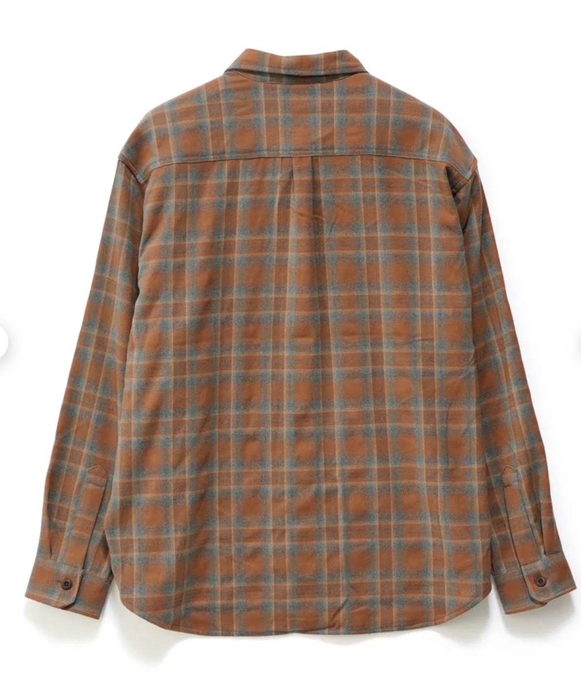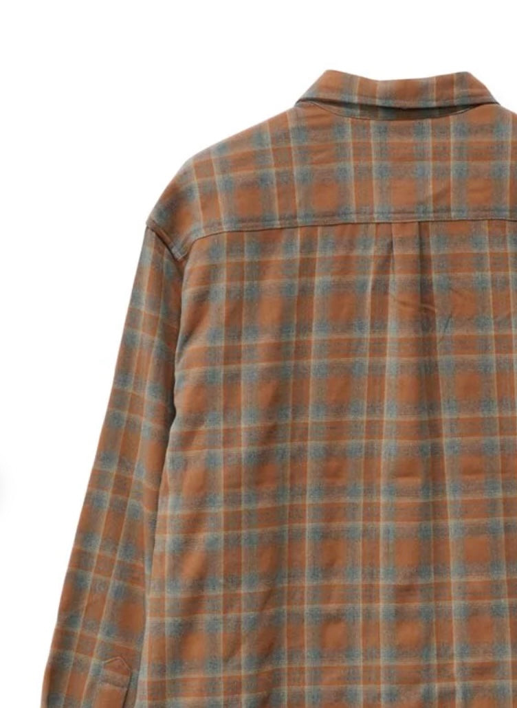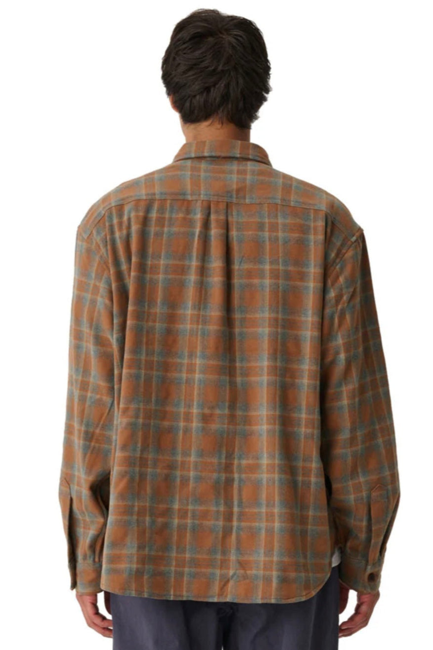 A classic button up plaid shirt with welt pokets a curved hem allowing you to wear it untucked. The weave is a warm brown/sienna complemented with cool toned grey.