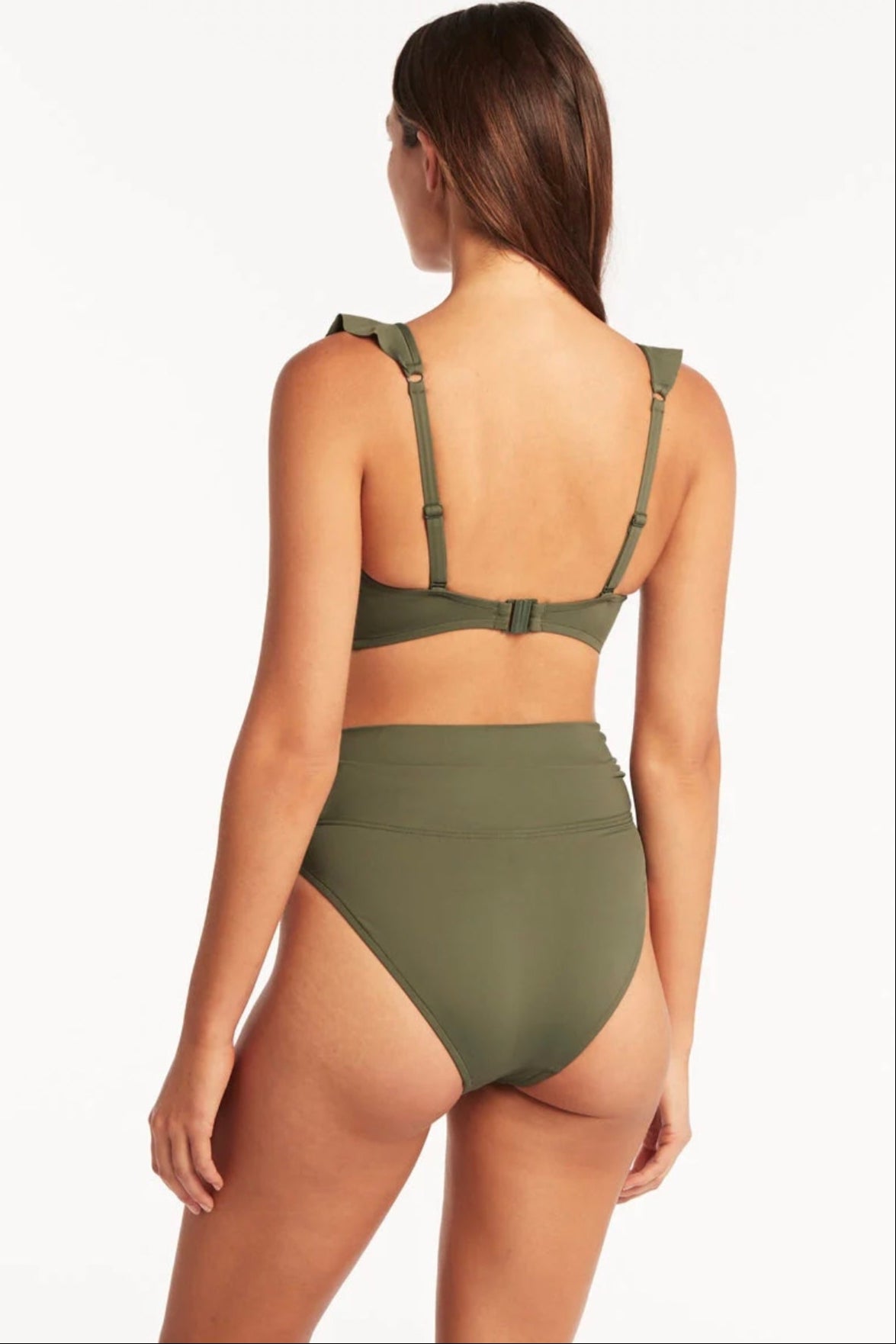 Soft folded ruched waistband, that can be worn high waisted or folded down. Powermesh lining for front & back support. Super flattering and comfortable style.